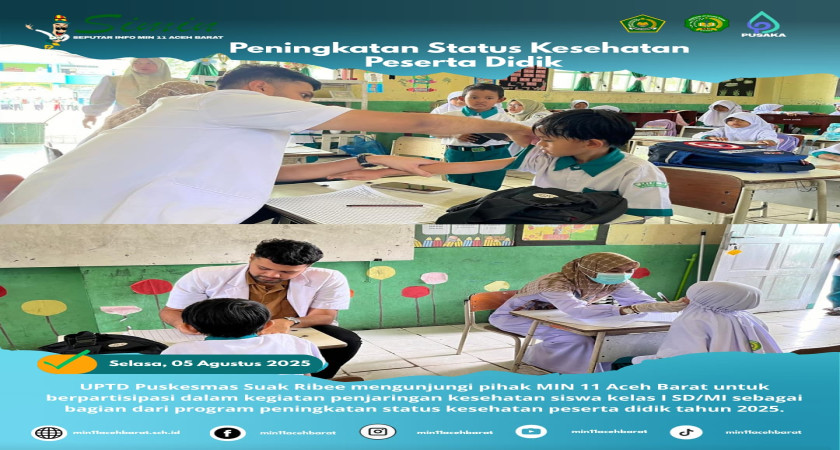Aceh Barat, 5 Agustus 2025 – Dalam rangka mendukung terciptanya generasi yang sehat dan kuat, MIN 11 Aceh Barat menerima kunjungan dari tim medis UPTD Puskesmas Suak Ribee untuk melaksanakan kegiatan penjaringan kesehatan peserta didik kelas I. Kegiatan ini merupakan bagian dari program nasional peningkatan status kesehatan peserta didik yang dilaksanakan secara berkala di tingkat SD/MI.