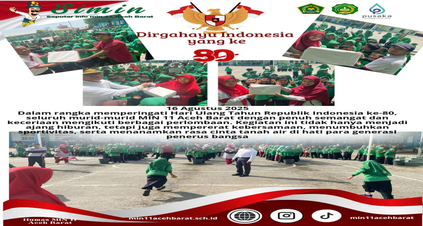Aceh Barat, 16 Agustus 2025 – Suasana penuh keceriaan dan semangat juang menyelimuti MIN 11 Aceh Barat saat seluruh murid, guru, dan tenaga kependidikan berkumpul di lapangan sekolah untuk memperingati Hari Ulang Tahun Republik Indonesia ke-80.
